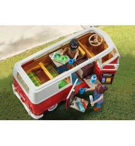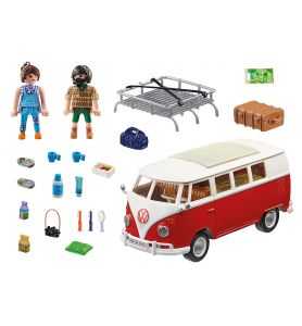 Un icono en la carretera: el Volkswagen T1 Camping Bus. Amado por generaciones. Incontables aventureros han viajado por el mundo en este camping bus. Por supuesto, también la versión PLAYMOBIL tiene muchos detalles característicos, como el frontal iconográfico en forma de V con separación de colores rojo y blanco y el logotipo rojo de VW, el techo redondeado, el parabrisas dividido y la baca del techo desmontable. Al abrir la sección del techo, el interior se hace visible. Con un estilo auténtico, el interior de la T1 ofrece una mesa plegable con dos asientos y un lavabo con nevera. Los bancos con el típico diseño de cuadros de los años 60 pueden convertirse en un área de descanso para dos personas. Las puertas laterales también pueden abrirse, una puerta incluye un estante para la comida y la otra un estante con bisagras y un espejo. El Volkswagen T1 Camping Bus: ¡sube, conduce y disfruta de la libertad! El set contiene dos figuras PLAYMOBIL, un Volkswagen T1 Camping Bus con techo desmontable y maletas, interior detallado con mesa de comedor plegable, asiento trasero plegable, puertas laterales con espejo y espacio para la comida y muchos otros extras.