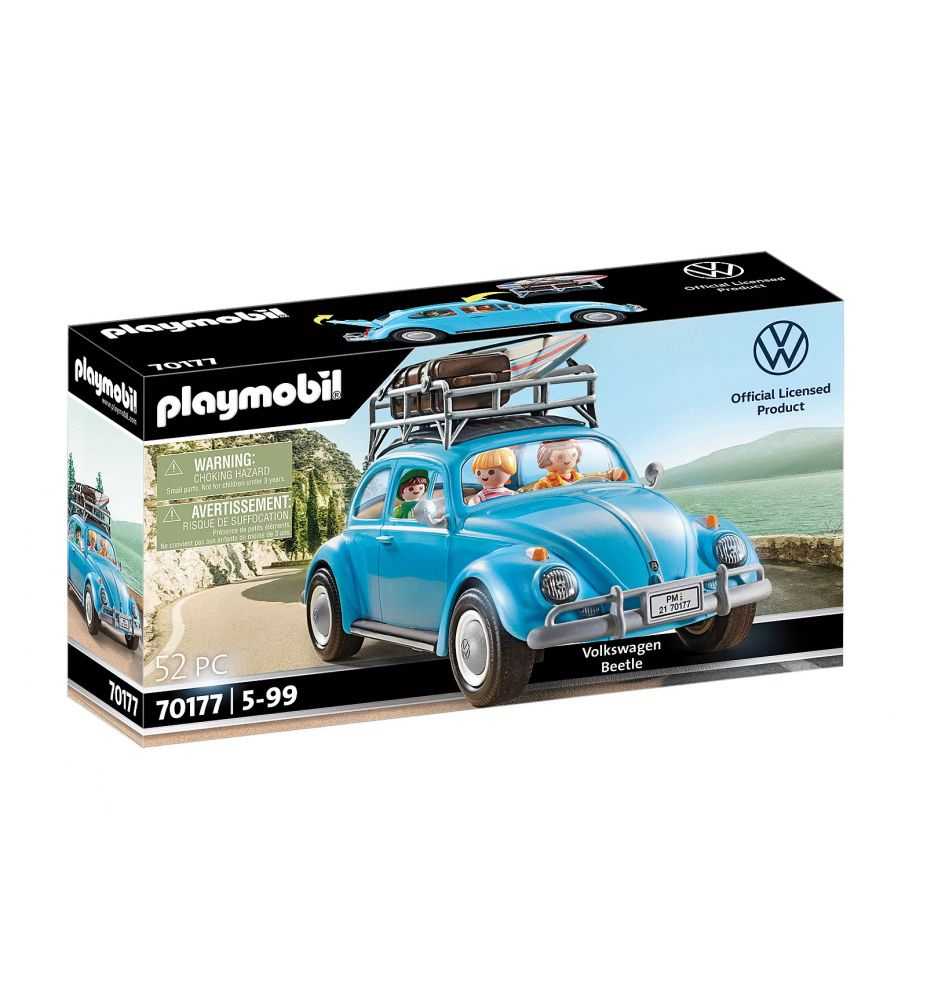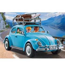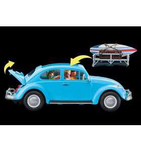 El VW Beetle es un verdadero clásico. Ahora el coche de culto con su inconfundible forma está entrando en el alegre mundo de PLAYMOBIL. Por supuesto, el Beetle PLAYMOBIL tiene todos los rasgos característicos que lo hacen tan único, como los guardabarros curvos, el logo de VW, el parabrisas vertical, la pintura azul y el típico capó trasero con un motor boxer de 4 cilindros. Al quitar el techo, se revela el interior diseñado con asientos, salpicadero y volante en color beige. En el asiento trasero hay espacio para el niño, así como una bolsa de frío, juguetes de arena y toalla. La maleta y la tabla de surf se pueden atar al portaequipajes del techo. ¡Ahora es el momento de entrar e ir a la playa! El juego contiene tres figuras de PLAYMOBIL, un Volkswagen Beetle de PLAYMOBIL con portaequipajes, techo desmontable y portón trasero que se puede abrir, tabla de surf, nevera, juguetes de arena y muchos otros accesorios.