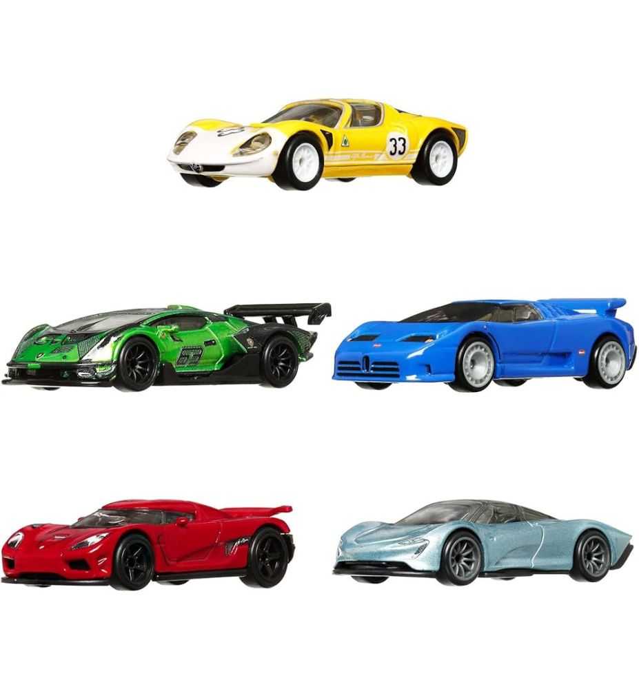 El multipack incluye los coches Lamborghini Essenza SCV12, Bugatti EB110 de 1994, Koenigsegg Agera R, Alfa Romeo 33 Stradale y McLaren Speedtail.