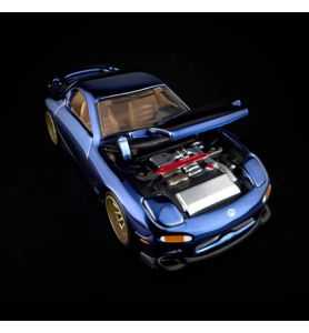 El Mazda RX-7 R1 de 1993 fue un cohete de producción limitada, listo para competir. Su motor rotativo biturbo de 1.3 litros, 255 caballos y altas revoluciones se combinaba con una transmisión manual de 5 velocidades y alerones delanteros y traseros. Nuestra réplica de la leyenda de las pistas luce pintura azul acero Spectraflame, un compartimento del motor detallado bajo un capó abatible y llantas Real Riders de 10 radios. Sin control de crucero ni techo corredizo, solo pura diversión deportiva que te hará sonreír.