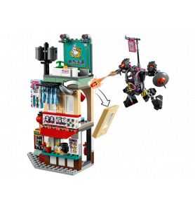 El set también contiene muchos elementos que invitan a jugar, como el enorme bastón extensible del meca LEGO® de juguete, el cañón del meca del toro clónico, el dormitorio de Monkie Kid situado encima del puesto y la máquina recreativa construible.