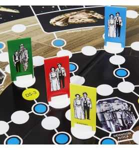 MOVERS DE PERSONAJES: Cada jugador elige su color y luego corre alrededor de la Estrella de la Muerte con dos motores de cartón. Luke y Leia aparecen en uno y Han y Chewbacca en el otro