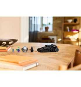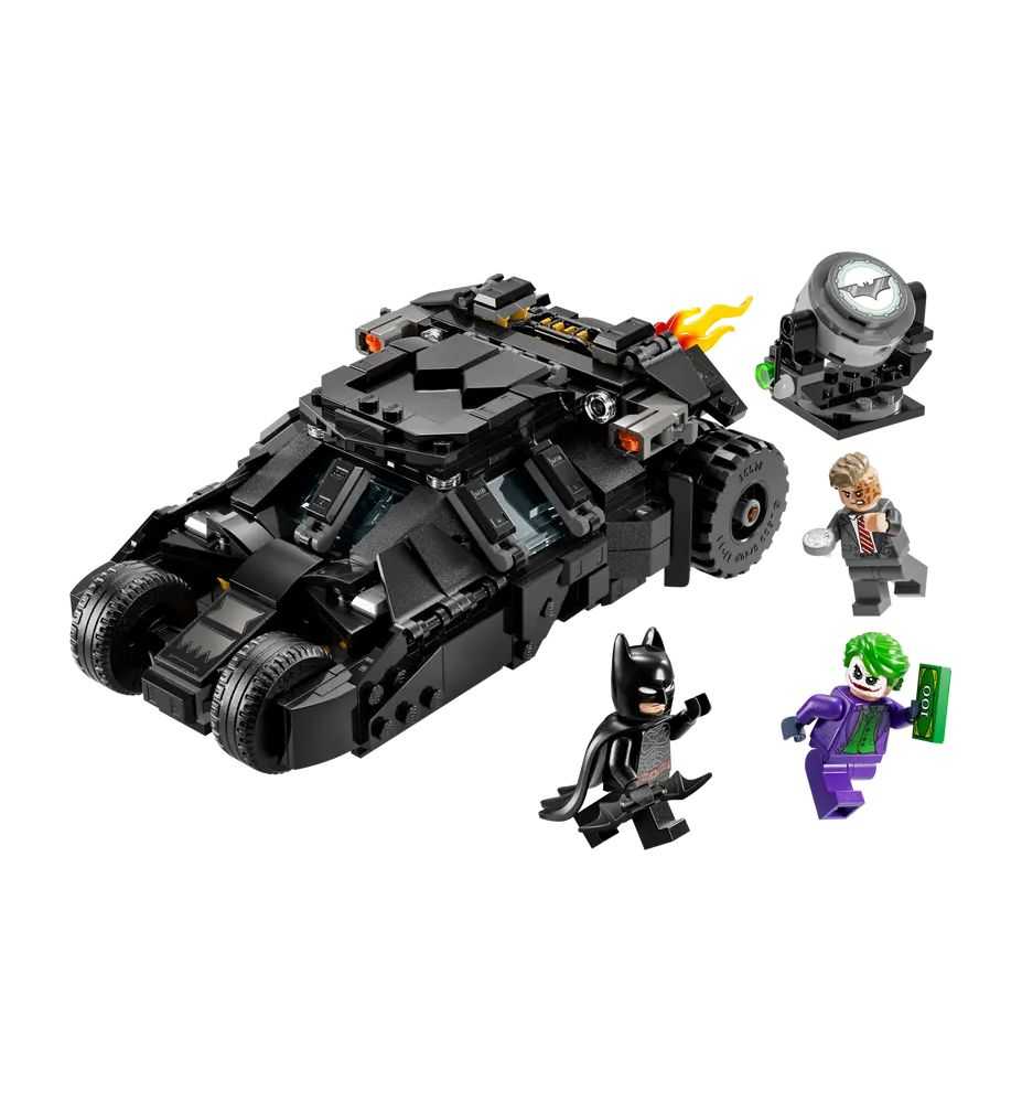 Este juego de LEGO Batman incluye 3 populares minifiguras: Batman (con su Batarang™), The Joker (con un fajo de billetes) y Two-Face (con su distintiva moneda de plata). Al abrir el Batmóvil Tumbler, los pequeños descubrirán un cuadro de mandos y un espacio para colocar a Batman. Además, el tubo de escape cuenta con un elemento extraíble que simula una llama. La Batseñal (que no se ilumina) puede inclinarse y girar 360° en ambas direcciones. Para añadir un toque digital, los constructores pueden usar la app LEGO Builder para acercar y rotar versiones 3D de sus modelos.