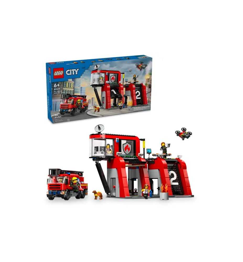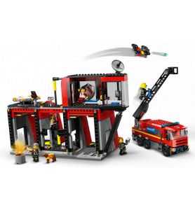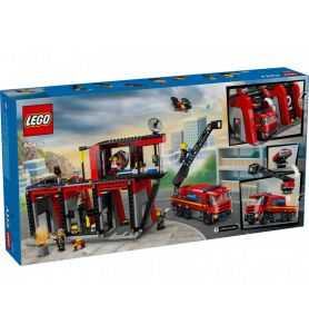 Características divertidas para los bomberos LEGO®: sala de control, cocina americana, cama y barra para las minifiguras de los bomberos, así como un camión con manguera, escalera de mano modular y accesorios de extinción.
