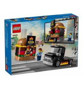 El set de juguetes LEGO® City Camión Hamburguesería (60404) es un regalo perfecto para la imaginación de los niños mayores de 5 años. Incluye un camión con un puesto de comida rápida móvil en forma de hamburguesa gigante, que se puede separar del camión. La zona de preparación detallada cuenta con condimentos y una ventana de atención al cliente que se abre, decorada con el letrero del negocio: una hamburguesa a la parrilla. El set también incluye minifiguras de una vendedora y un cliente con un audífono.