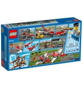 ¡Forma parte del espectáculo en el aeropuerto de LEGO® City! El set cuenta con un hangar con espacio para un avión, 2 reactores con cabinas abatibles y un avión clásico con hélice giratoria, un coche del servicio aeroportuario, un barril de gasolina con manguera que se puede desenrollar y un carrito de herramientas con portaherramientas. Incluye 6 minifiguras.