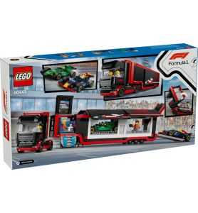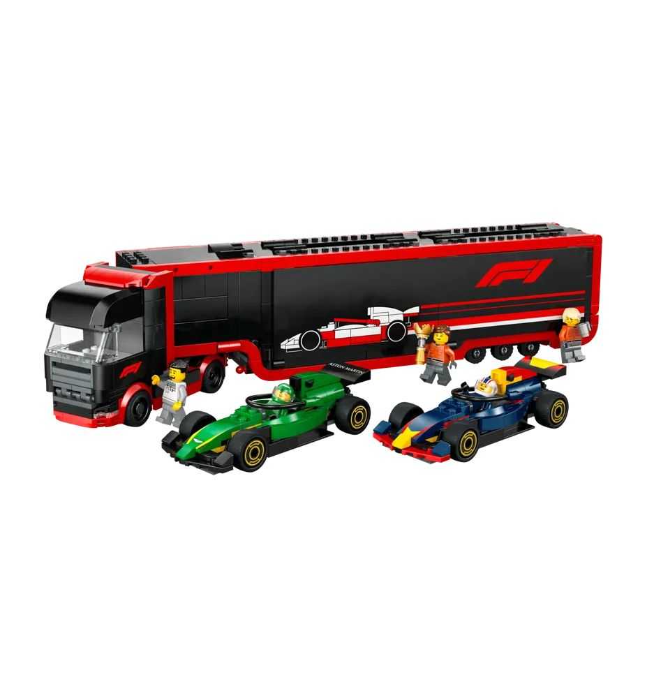¿Qué incluye la caja? Todo lo necesario para construir un camión de transporte de F1® de juguete LEGO® con un remolque aerodinámico, 2 coches de carreras de Fórmula 1® y minifiguras de 2 pilotos y 3 miembros del equipo, además de un trofeo.