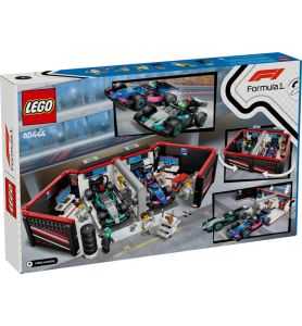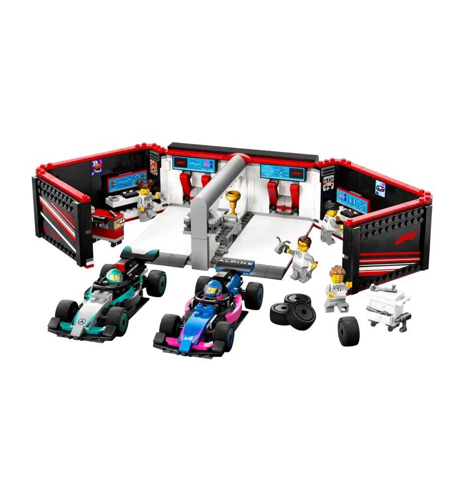 ¿Qué incluye la caja? Contiene un garaje de coches de juguete con bancos de trabajo, carros de herramientas, soldadura, una torre de neumáticos lisos, 2 coches de carreras de F1®, un trofeo y minifiguras de 2 pilotos y 4 mecánicos.