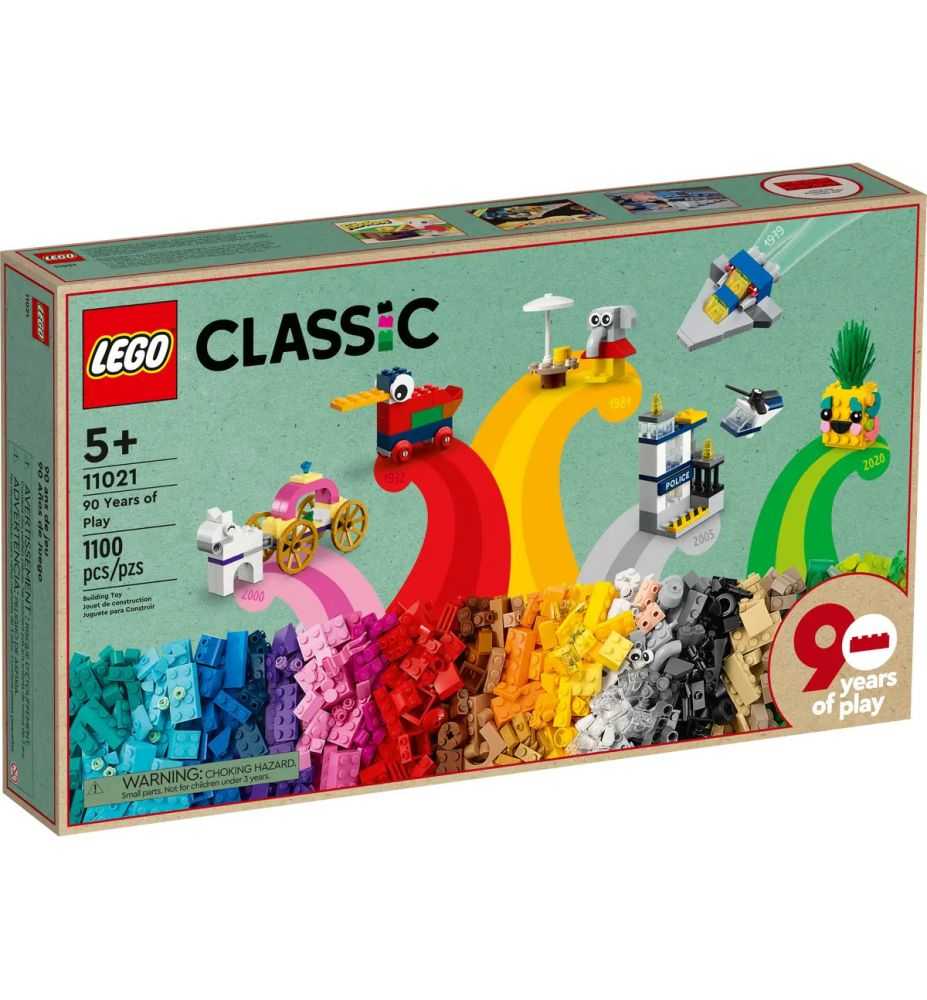 El set de construcción LEGO® Classic 90 Años de Juego (11021) reserva a niños, adultos y abuelos la oportunidad de disfrutar de infinitas horas de diversión y nostalgia. En homenaje a una historia viva de juguetes infantiles que siempre han promovido el juego creativo, este set contiene un arcoíris de coloridas piezas LEGO, 15 recreaciones en formato minimodelo de emblemáticos juguetes LEGO de diferentes épocas, ¡y ladrillos adicionales para construir con libertad!