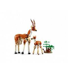 El set LEGO ofrece a los niños un mundo de posibilidades para jugar, ya que pueden construir tres animales diferentes con las mismas piezas: una jirafa articulada con un árbol y un flamenco, dos gacelas articuladas (madre y cría) con dos arbustos, o un león con un árbol y una mariposa.