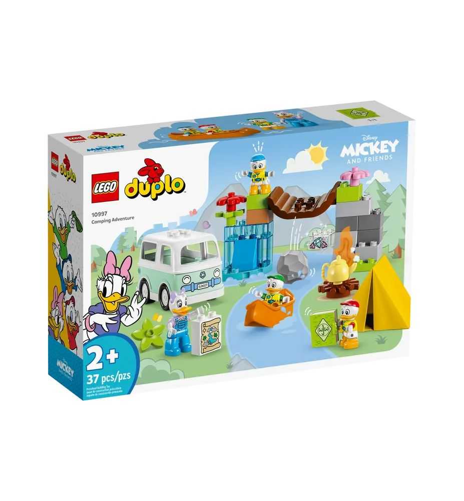 El set incluye una canoa, una autocaravana conducible y una tienda de campaña de tela, así como 4 figuras LEGO® DUPLO® de personajes Disney (la Pata Daisy, Juanito, Jaimito y Jorgito). Los niños pueden conducir la autocaravana, montar la tienda de campaña, buscar un tesoro o navegar en canoa bajo un puente colgante.