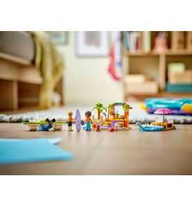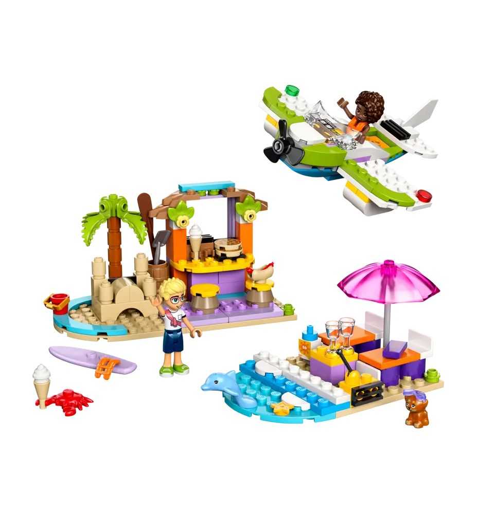 Este set, que fomenta el juego simbólico, incluye todo lo necesario para que los niños construyan un hidroavión con hélice giratoria, un área de recreo con tabla de surf y un chiringuito de playa con castillos de arena, taburetes y helados. Los modelos se pueden convertir en una lancha motora, un área exterior con asientos y una pizzería con horno. El juguete incluye 2 minipersonajes, así como figuras de una perrita y un delfín.