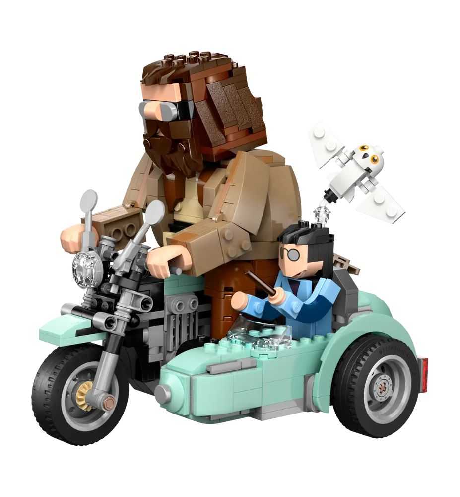 Tres personajes LEGO® Harry Potter™ para construir: El modelo incluye figuras articuladas de Harry Potter, Hedwig™ y Rubeus Hagrid™, integradas en la moto voladora con sidecar de Hagrid.