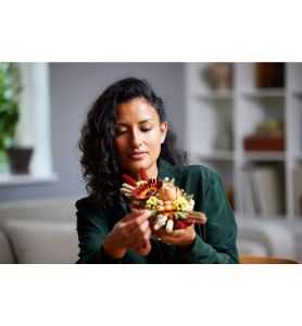 - Inspiración otoñal: Este kit de construcción para regalo está lleno de vibrantes flores inspiradas en los colores del otoño e incluye una gerbera y una rosa como elementos focales de la composición