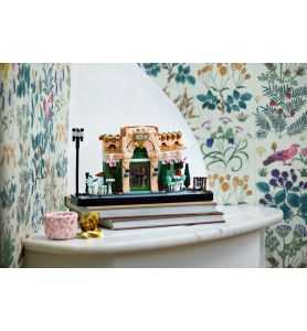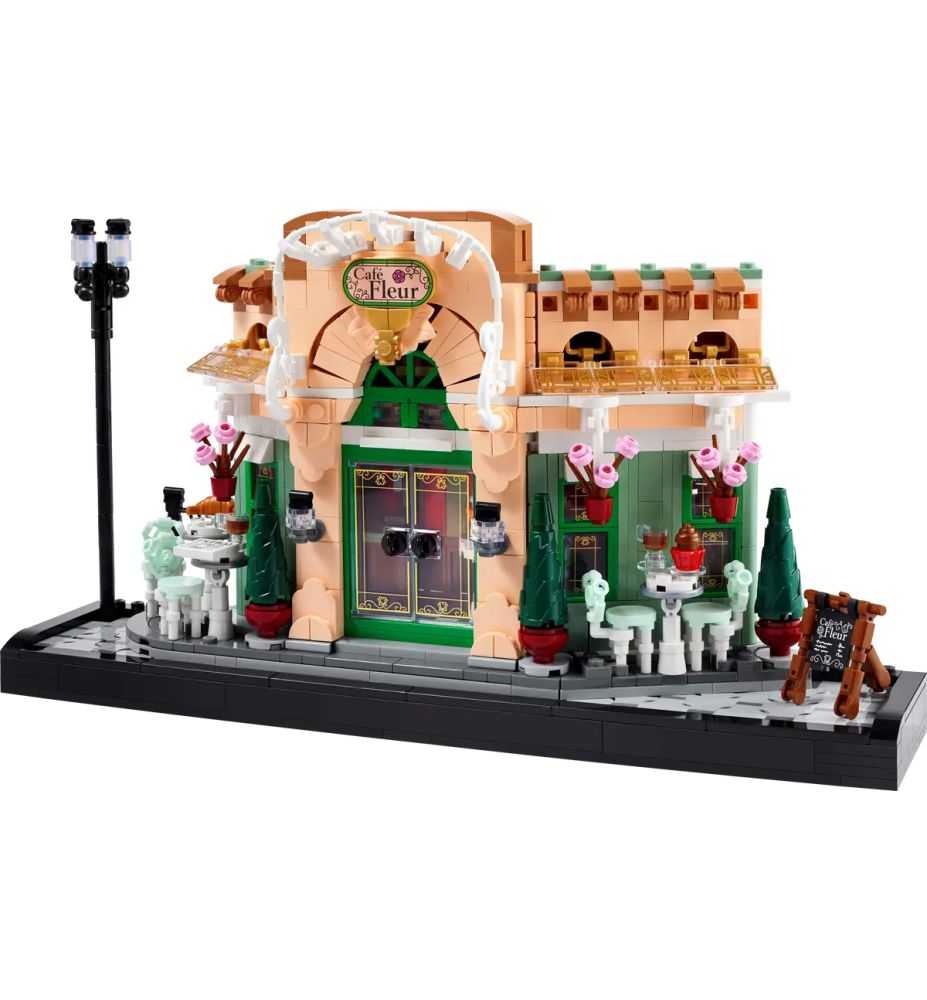 Una acera construible con farolas clásicas enmarca el Café Fleur, con su pintoresca fachada, ornamentados asientos, macetas colgantes y puertas dobles que se abren para vislumbrar un acogedor interior con un señorial papel pintado y muebles de madera oscura. Llena de elaborados detalles y accesorios (desde cruasanes y tazas hasta un periódico y una caja registradora), esta maqueta reproduce la esencia de un bistró clásico y, por su anchura y parte trasera plana, es ideal para exponerla en un estante.