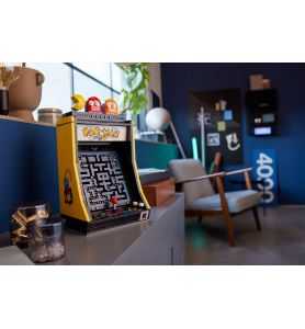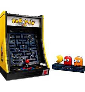 - ¿Qué contiene la caja? Lo necesario para construir la máquina recreativa de PAC-MAN y un expositor con figuras giratorias de PAC-MAN, BLINKY y CLYDE, además de una escena de unos recreativos de la década de 1980 con una minifigura de una jugadora