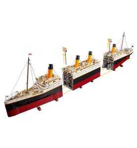 Esta maqueta a escala 1:200, diseñada en 3 secciones, reproduce fielmente las características del Titanic. La sección transversal deja ver los detalles del interior, como el comedor de primera clase, la Gran Escalera, una de las salas de calderas y numerosos camarotes para los pasajeros de las diferentes clases. Da vida a la historia del Titanic creando su puente, cubiertas de paseo, salón de lectura, piscina y otras instalaciones.
