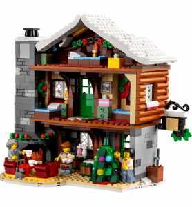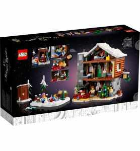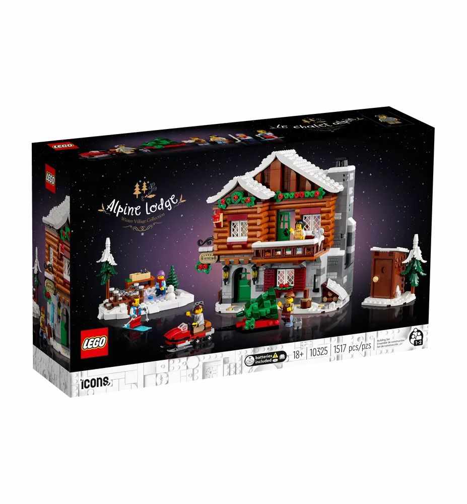 - ¿Qué contiene la caja? Todo lo necesario para construir el Refugio Alpino de 3 plantas, una zona de patinaje exterior, un aseo, una motonieve y un remolque, así como un árbol de Navidad, 5 minifiguras y figuras de un gato, un pájaro y una ardilla