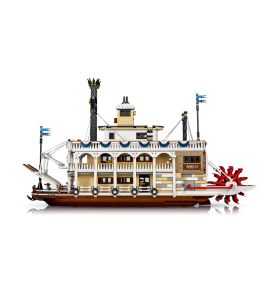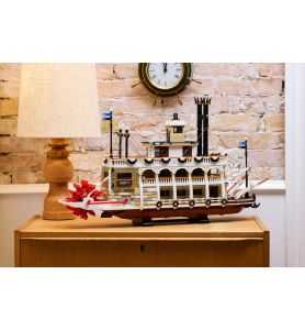 Mueve el modelo sobre una superficie para hacer funcionar la rueda de paletas conectada a la máquina de "vapor", y dirígete en el timón girando el gobernalle en la caseta de gobierno (o la rueda exterior). También puedes ajustar las pasarelas de embarque y lanzar el ancla. Adéntrate en distintas áreas del barco, como la caseta de gobierno, el camarote de la tripulación y el baño en la cubierta Texas; el escenario y el restaurante en la cubierta principal; y la cubierta de calderas, donde podrás encontrar una cocina y un museo con un pistón LEGO funcional, una máquina de vapor de Watt y más componentes.