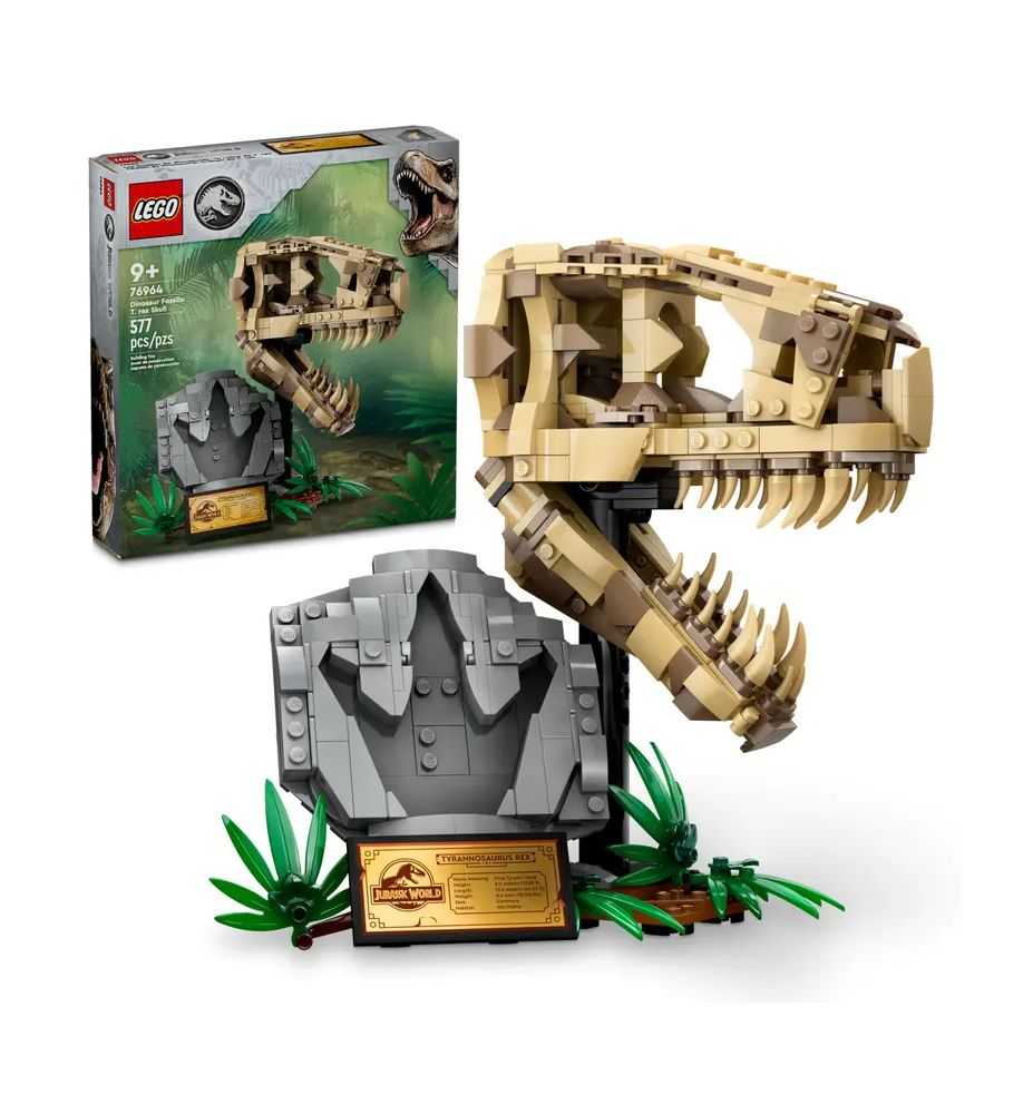 Inspira a tu joven paleontólogo o amante de los dinosaurios de 9 años o más con el juguete LEGO® Jurassic World Fósiles de Dinosaurio: Cráneo de T. rex (76964) para niños y niñas. El primer set Jurassic World diseñado para exponer incluye un cráneo con mandíbula móvil, un soporte con placa informativa, un fragmento de “ámbar” oculto en la parte posterior del modelo y una huella “fosilizada”.