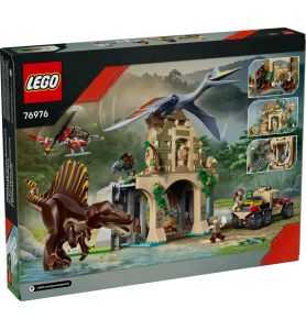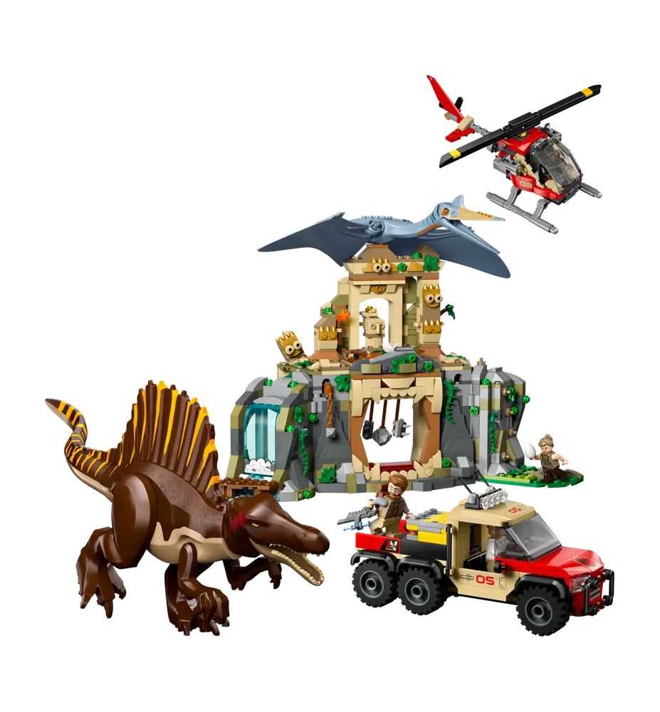 Juguetes inspirados en Jurassic World: El renacer en un set LEGO®: incluye figuras de un Spinosaurus y un Quetzalcoatlus, 4 minifiguras de personajes de la película, un templo antiguo, un helicóptero, un camión de transporte de dinosaurios y más.