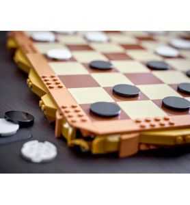 Esta divertida versión construible del popular juego de mesa familiar incluye las piezas del ajedrez y las fichas de las damas, así los pequeños estrategas pueden disfrutar de dos juegos en uno. Cuenta con elaborados detalles, como estatuas de minifiguras sobre las reinas y elementos de brillante color dorado. Una vez construido, el set se convertirá en un objeto de decoración para el escritorio totalmente único que también puedes dividir en dos para guardarlo con facilidad. ¡Jaque mate!