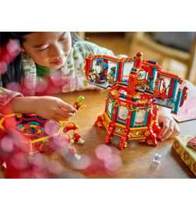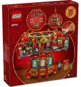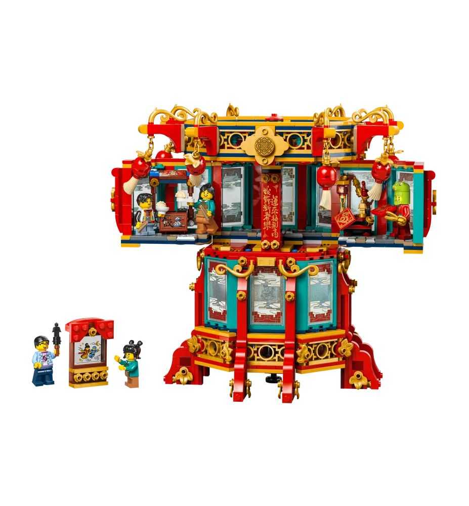 El farol también es un juguete inspirador para los niños creativos, basado en el juego simbólico. La parte superior del farol se puede quitar para acceder al nivel superior desmontable, que al abrirse revela 3 escenas festivas con un teatro de sombras y puestos de comida y adornos construibles. El set incluye 5 minifiguras (2 adultos, 2 niños y un personaje disfrazado del año de la serpiente).
