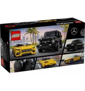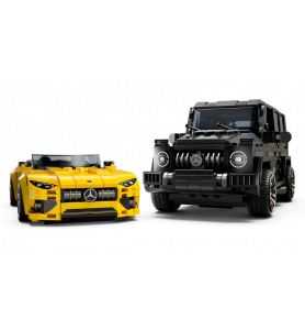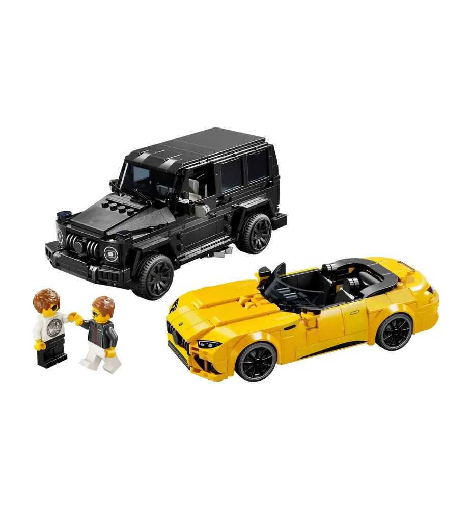 El todoterreno deportivo Mercedes-AMG G 63 negro y el descapotable AMG SL 63 amarillo tienen detalles de diseño fieles a las versiones reales, como parrillas delanteras, capós, interiores detallados y los característicos colores de Mercedes. Cada coche viene con una minifigura de un conductor para que los niños puedan simular carreras.