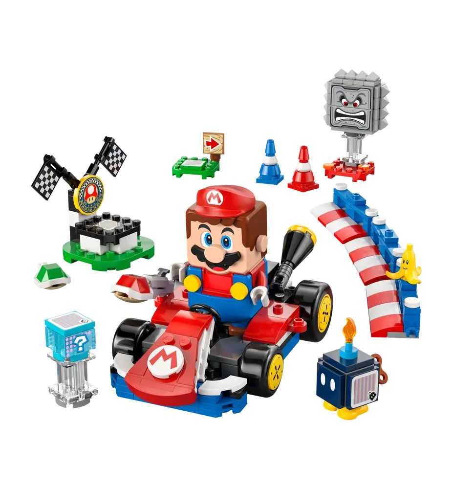Juguete interactivo: Corre con LEGO® Mario™ en el Kart estándar, gana recompensas digitales de la caja de objetos, derrota al Bob-omb y a la Roca Picuda, y observa cómo reacciona LEGO Mario a las placas LEGO verde y roja, entre otros.