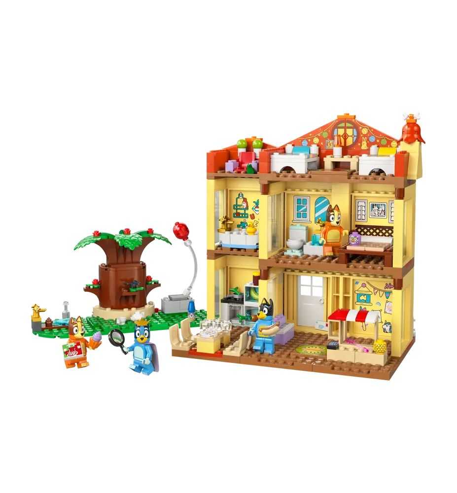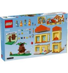 Esta casita modular incluye cuatro minifiguras: Bluey, Bingo, Chilli (la mamá de Bluey) y Bándit (el papá de Bluey). Además, viene con accesorios como una capa arcoíris, una varita y lupas. Todas las habitaciones son desmontables. En el cuarto de juegos hay una casa de muñecas, un piano y un puesto de comida. La cocina está equipada con frigorífico, horno, fogón, mesa y sillas. En la planta superior se encuentra la habitación de Mamá y Papá, junto a un baño. La habitación del ático de Bluey y Bingo incluye una alfombra, lámpara y una figura de Charlatán. Al lado, se halla el trono de la reina, con tetera, taza y rana. En el jardín hay un gran árbol, un perrito caliente, pizza, un grifo, el gnomo Jeremy y un globo.