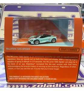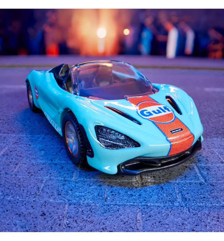 Refinado a lo largo de generaciones, el McLaren 720S Spider es la impresionante encarnación de la velocidad, la emoción y la aerodinámica. Nuestro modelo Matchbox Collectors 1:64 recrea este superdeportivo con un acabado satinado en azul claro y detalles en naranja. Incluso le pusimos los colores de carreras de Gulf para reflejar la prestigiosa y prolífica herencia de carreras de McLaren.