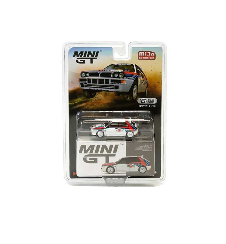 Modelo a escala 1/64 fabricado por TSM Model en la línea Mini GT, hecho de metal. El modelo representado es un Lancia Delta HF Integrale Evoluzione Martini Racing. La miniatura mide aproximadamente 7 cm de longitud.