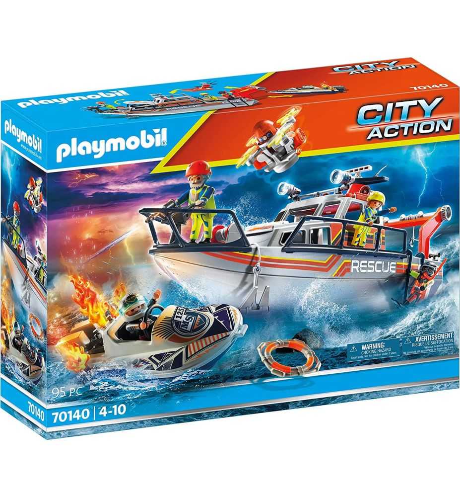 Contenido: 1 PLAYMOBIL City Action Rescate marítimo: Extinción de incendios con barco de rescate, juego de 95 piezas con instrucciones: 1 barco, 1 lancha, 4 figuras, 89 accesorios. Material: Plástico, barco largo x profundidad x alto (sin antena): aprox. 39-46 x 16,5 x 18 cm. Lancha sin llamas: aprox. 18,5 x 9 x 7 cm. Peso: 810 g, 70140