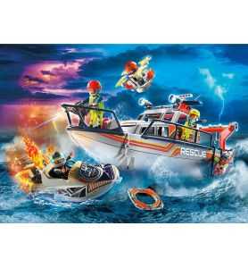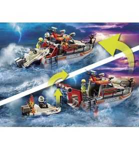 Atención, héroes: PLAYMOBIL Operación de extinción de incendios con barco de rescate, lancha rápida, dron, 1 conductor y 3 rescatistas para el rescate en alta mar
